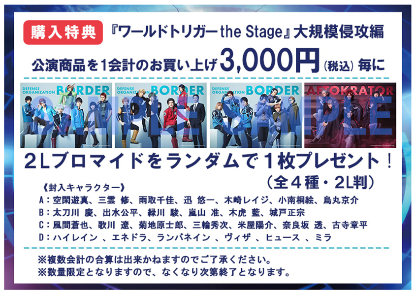 ※劇場でご購入いただいた場合に限り、蔵出し商品、『ワールドトリガー the Stage』 Blu-ray/DVDも特典対象となります。公式通販、アニメイト(池袋本店、京都店)、2.5次元ショップでご購入の際は『ワールドトリガー the Stage』大規模侵攻編のグッズのみが対象となりますので、予めご了承ください。