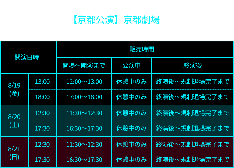 ・公演時期の情勢、当日の販売状況により、劇場での公演グッズの販売ができなくなる可能性や販売時間が変更になる可能性があります。