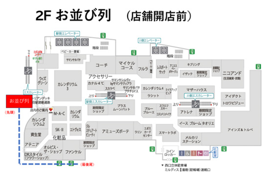 各日、店舗開店時(10:00)までにお越しのお客様は「2F駅側 店舗正面入口」にて整列いただき、開店と同時にご案内をさせていただきます。